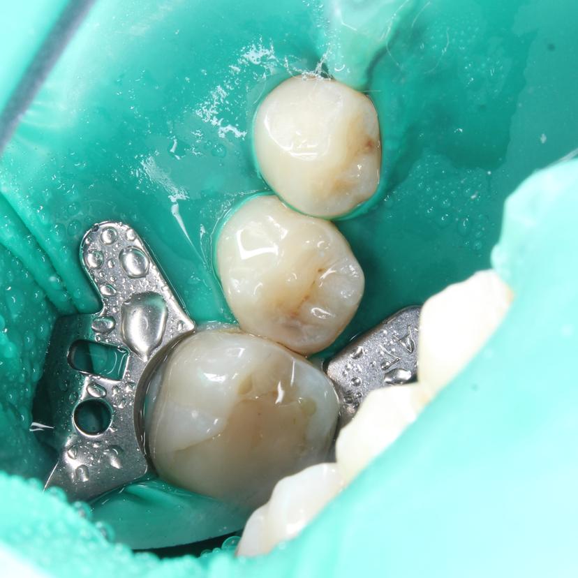Лечение зуба 2.6 происходило с использованием микроскопа и коффердама (изоляция зуба во время лечения он влаги- зеленый платок на фото)